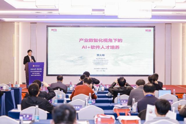 用友集团新道科技股份有限公司副总裁贾大明以“产业数字化视角下的AI+软件人才培养”为题,从数智时代的产业之变、数智时代的软件之变和从数智时代的人才培养建议三方面介绍了企业界在软件人才培养的思考与探索。