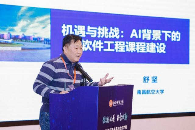 教育部高等学校软件工程教学指导委员会委员、南昌航空大学软件学院舒坚教授以“机遇与挑战:AI背景下的软件工程课程建设”为题,深入分析了AIGC给我们带来的机遇和挑战,从团队建设、内容建设、资源建设、教材建设和机制建设等方面分享了AI背景下软件工程课程建设经验。