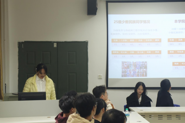 学院团委大学生民族联谊会负责人王思钰详细介绍25级及本年度全院少数民族学生人数与民族构成情况。